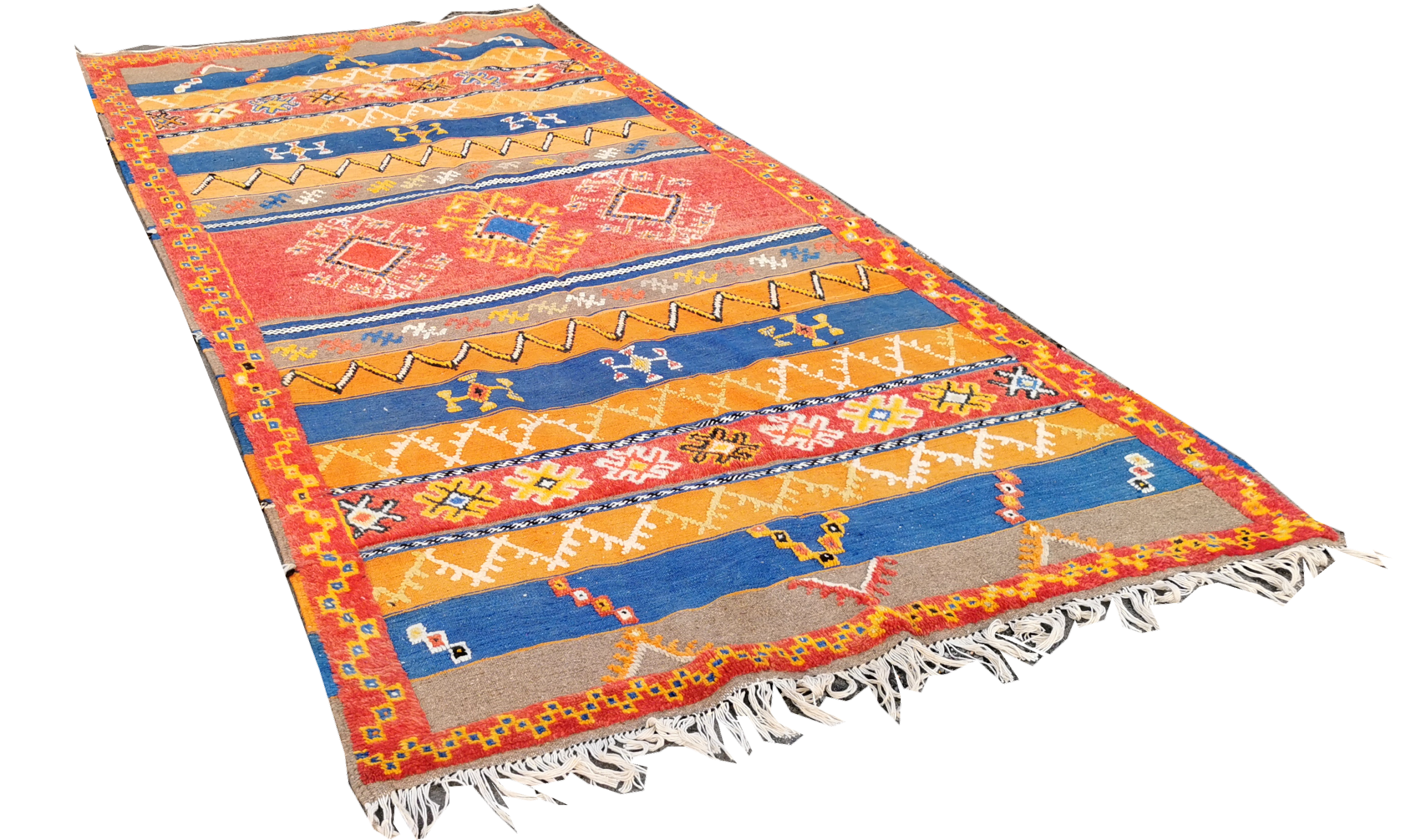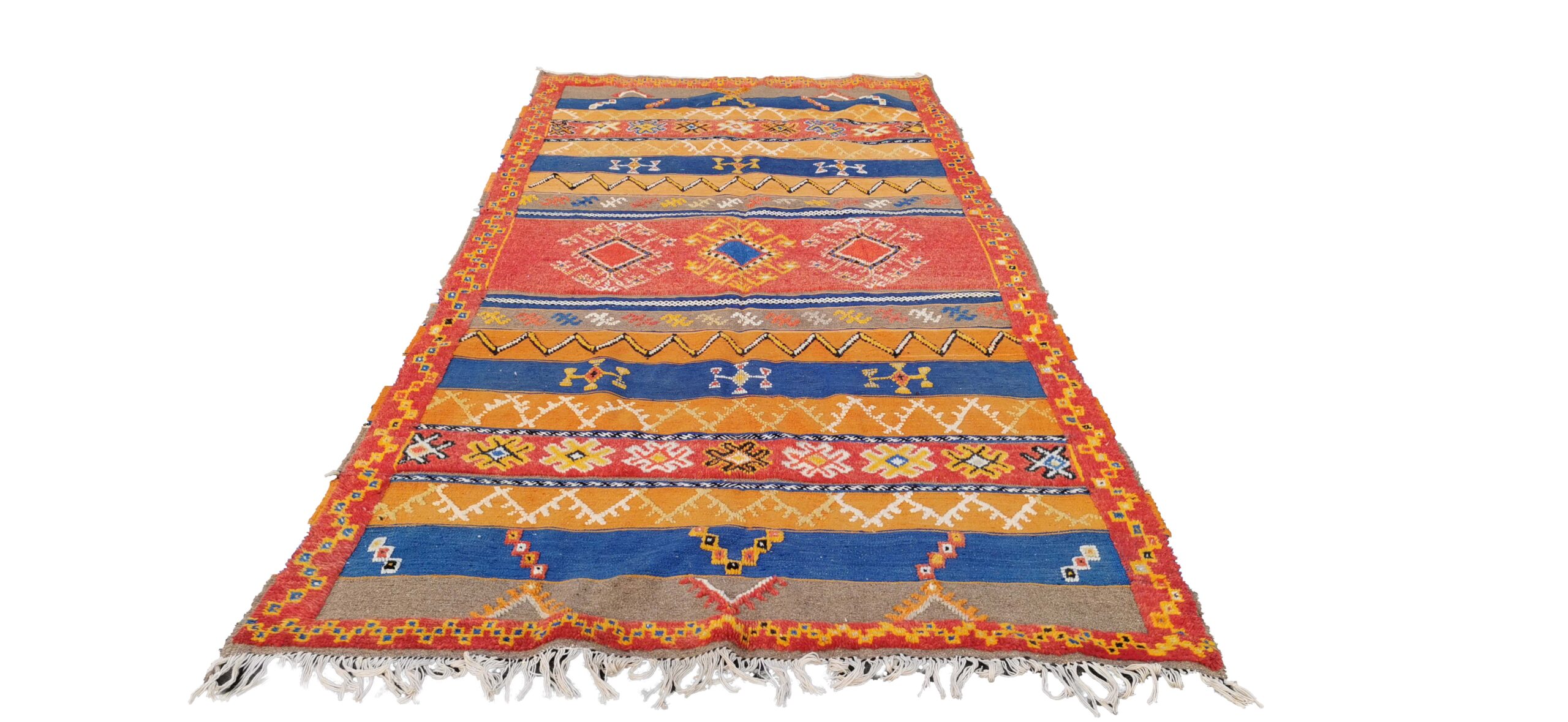 Made from Camel and sheep wool, Glaoui rugs are known and valued by the complexity of their making. In fact, they combine three techniques of weaving: the kilim, knotted stitch and embroidery in relief. Kilim rugs are woven flat; the rendering is soft and lightweight. This technique is different than knotted which gives a velvety and soft mat. These rugs are made entirely by hand by the Berber women in the Ouarzazate region. Wool is dyed with natural dyes only. 235x120cm This rug will fit easily in your home with a touch of warmth and authentic. It can also be used in wall hanging.