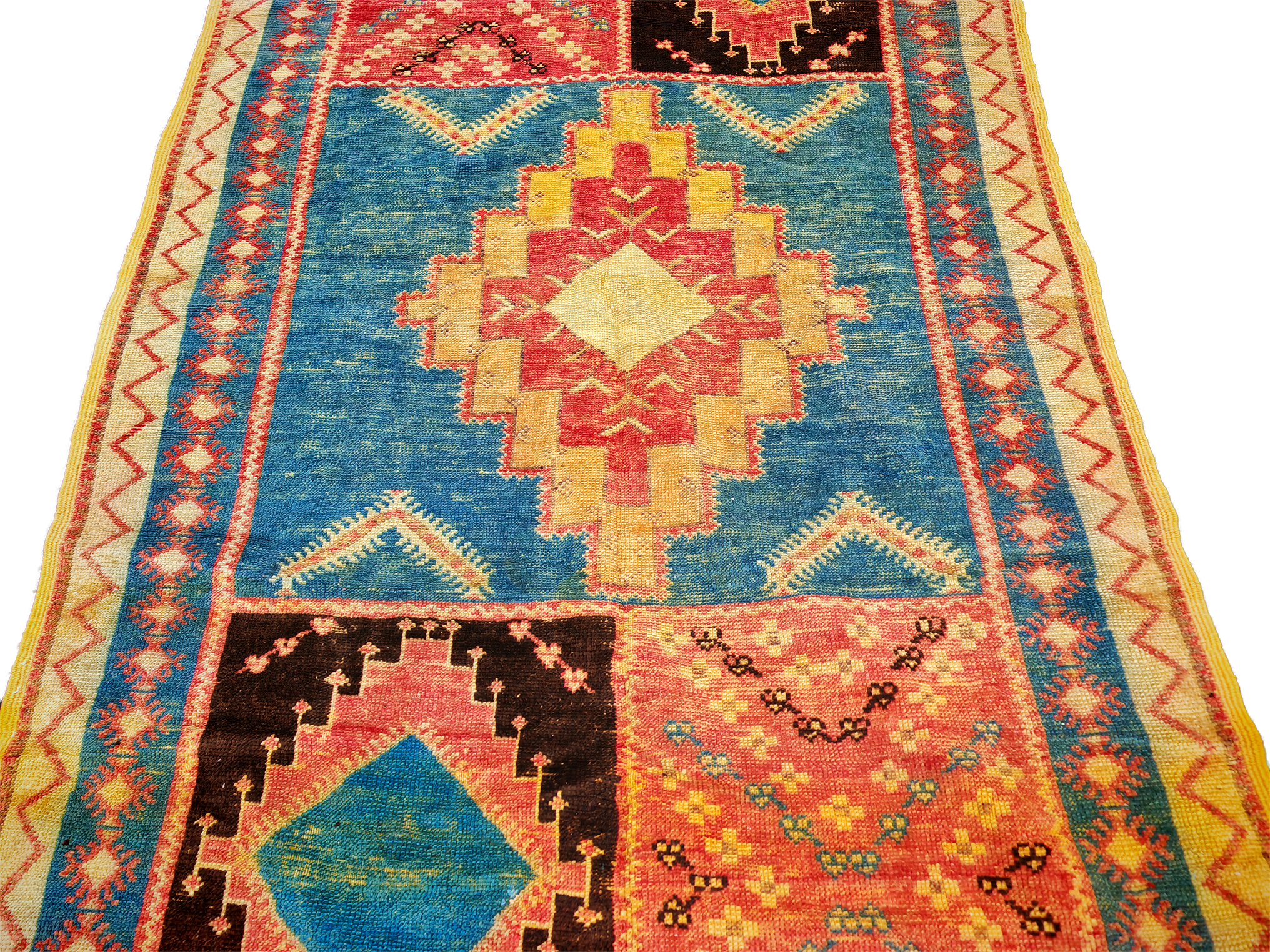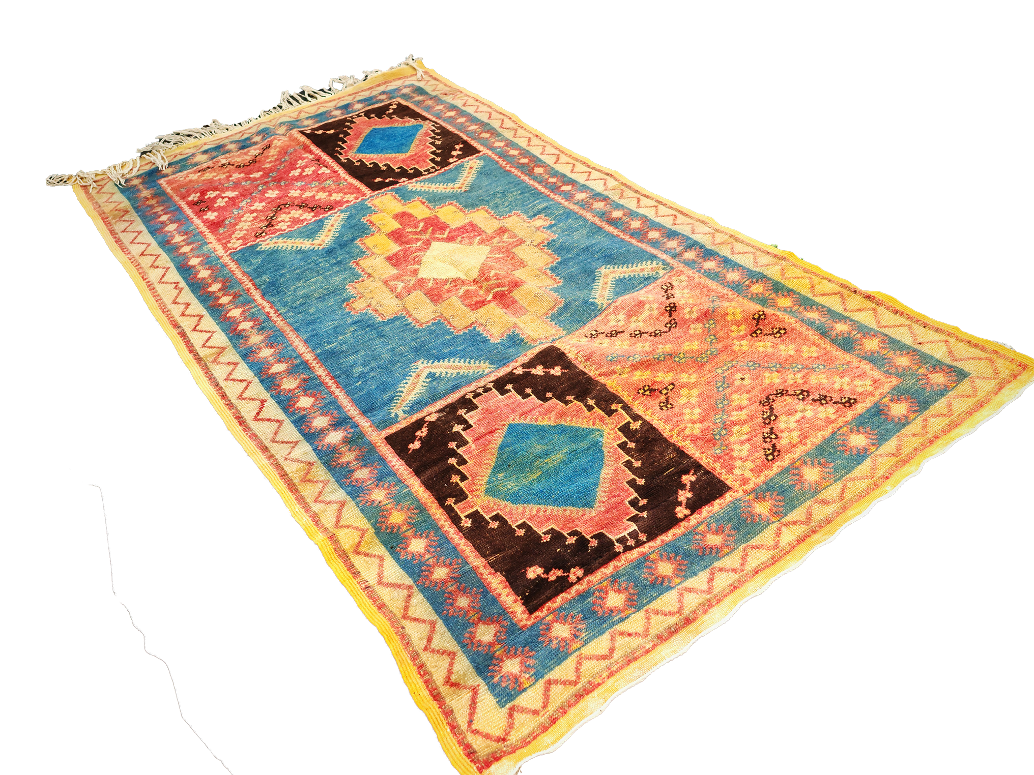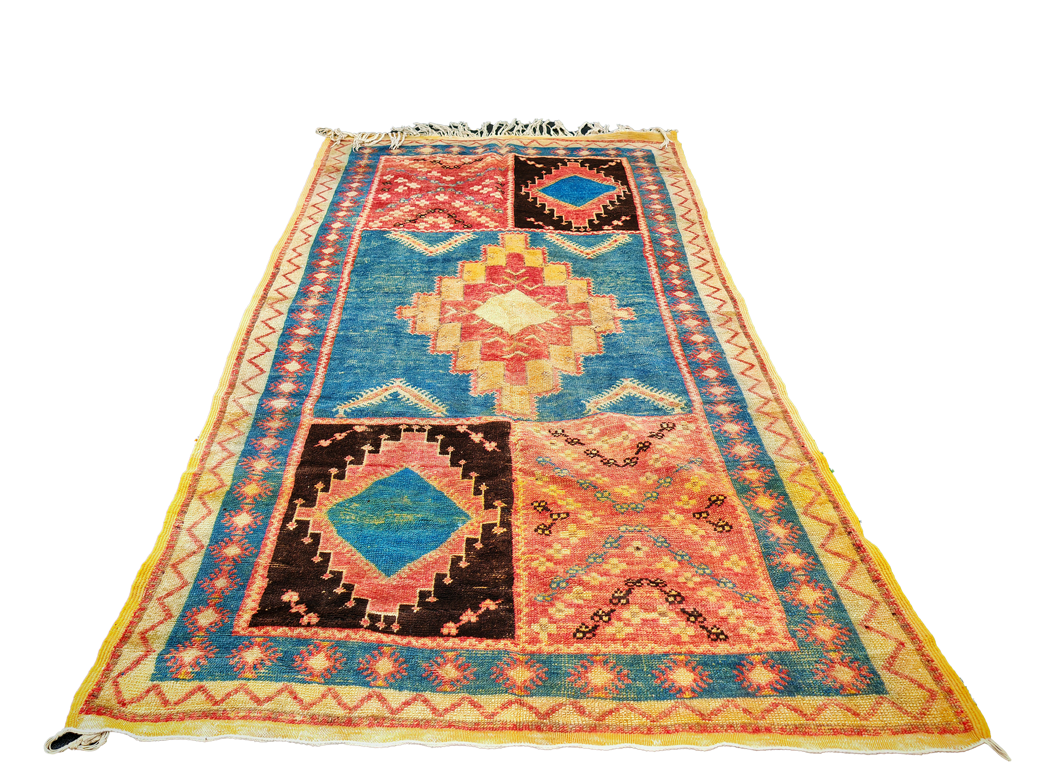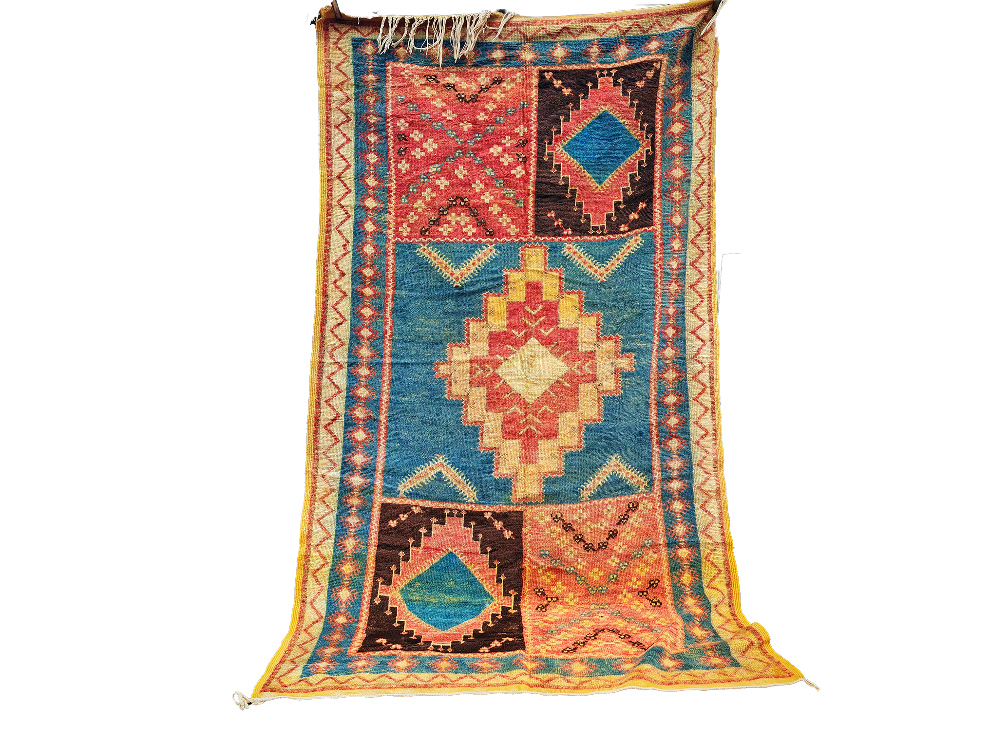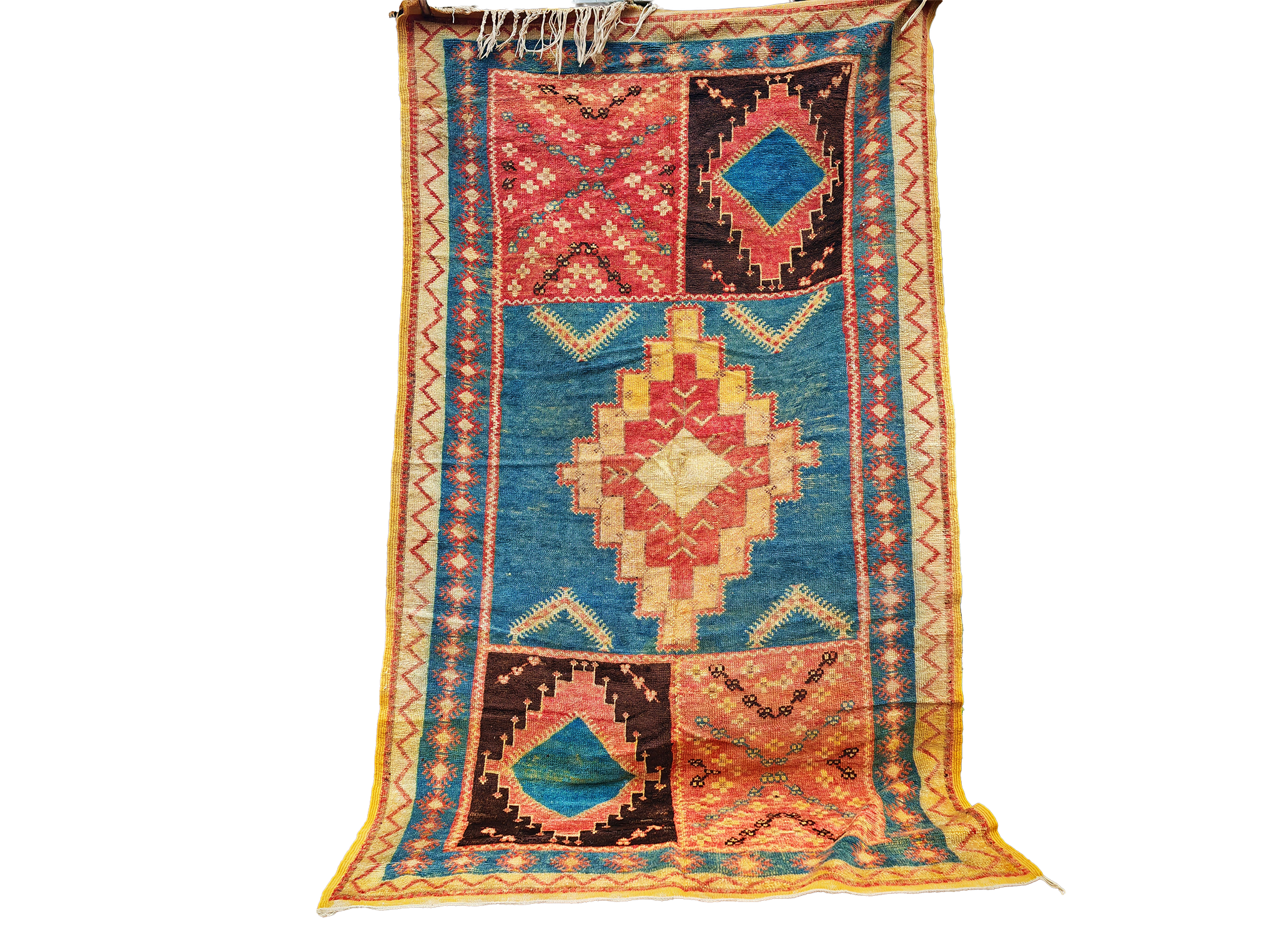 Handmade Moroccan Tuareg carpet from Ait Ouagherda tribal hand woven in middle atlas of Morocco The incredible mixtures of colors: blue yellow, black or white are carefully distributed and harmoniously associated with Berber drawings, lines, stripes and lengths. The Berber artistic expression and the precision of the composition of the Hanbel carpet raises the rich creativity of the Berber weavers.