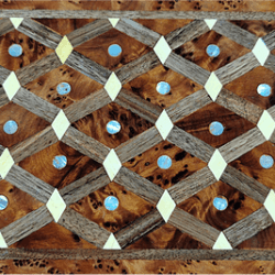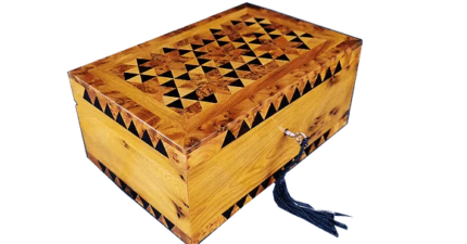 T112- Handmade Inlaid Jewelry Box. 10.6×7.4×3.9″ Thuya Burr and Lemon Wood.