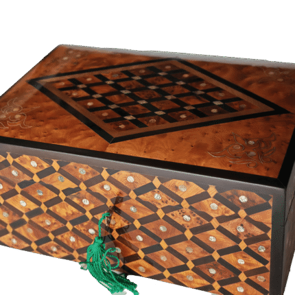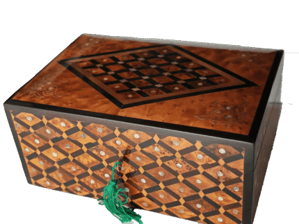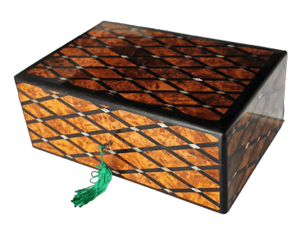 T161-Luxurious Inlaid Jewellery Box. 7.9×5.5×2.7 ″ Thuya Burr, Mother Pearl and Ebony