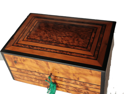 T163- hand Inlaid Jewellery Box, Thuya Burl and Lemon Wood.